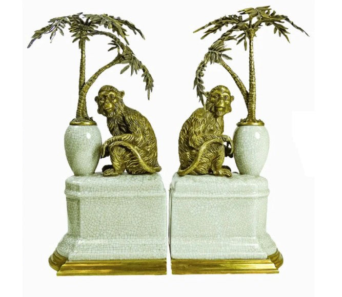 Handmade from high-quality porcelain and brass, part of the imperial collection, the Bombay bookend set is a stunning luxury item. The Bombay set is made in limited numbers, the carefully crafted brass monkeys and palm trees sit atop a delicate yet strong porcelain, triple glazed and fired finished in a stunning antique crackle white. A treasured Heirloom to be passed down for Generations
