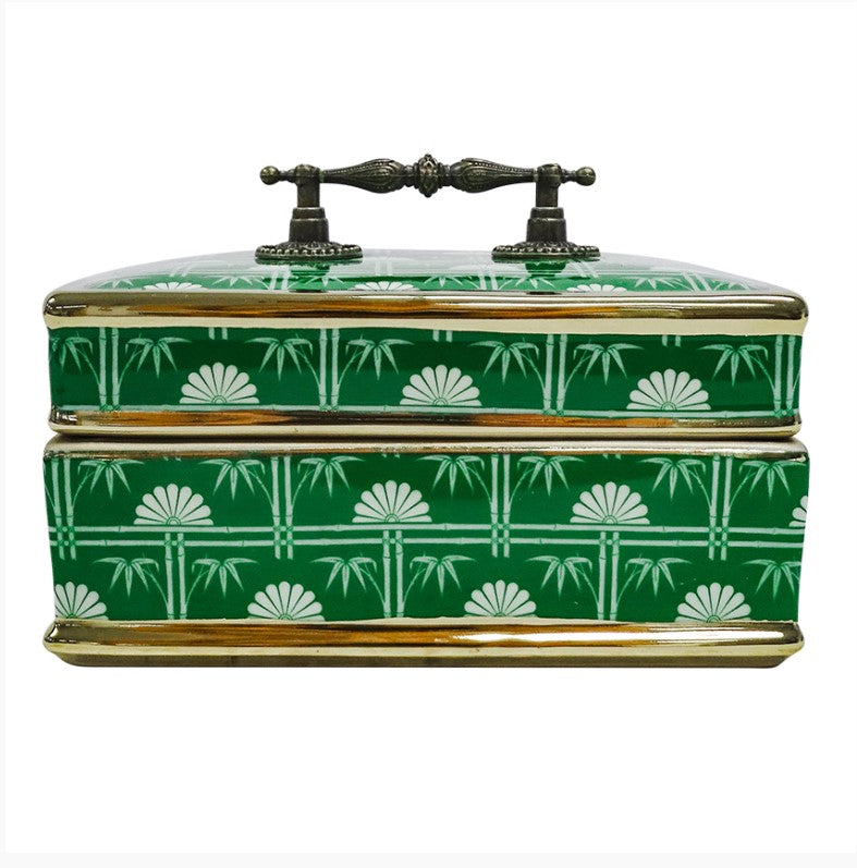 Ceramic trinket box with unique Green Bamboo design. Ideal for jewellery storage or decoration in a coastal-style home or beach house, or as a gift.